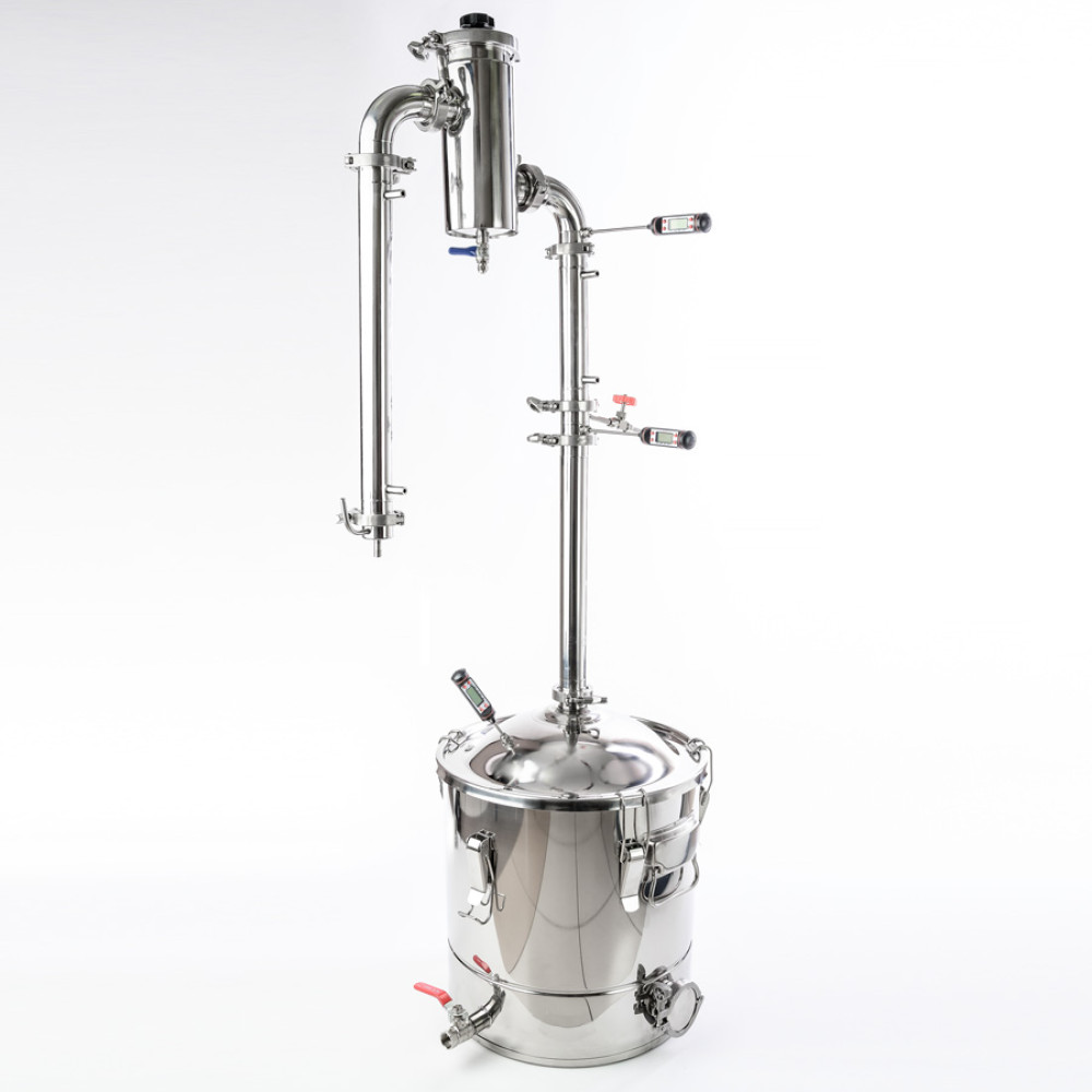 The set is able to cover the needs for any type of alcohol - vodka, moonshine, whiskey, cognac, liqueurs. The stainless steel gin basket makes it easy to flavor the finished drink using gin technology without placing herbs and berries in gauze bags. In addition, an internal groove is made on the distillation cube for quick and easy installation of a false bottom with a diameter of 300 mm to avoid sticking thick aromatic bregs. Technological units are provided for collecting heads and draining the accumulated fusel oils in the gin basket without stopping the working cycle. The cube is equipped with a reliable bimetallic thermometer, and an electronic thermometer in the column allows you to control the operating mode of the mash column.